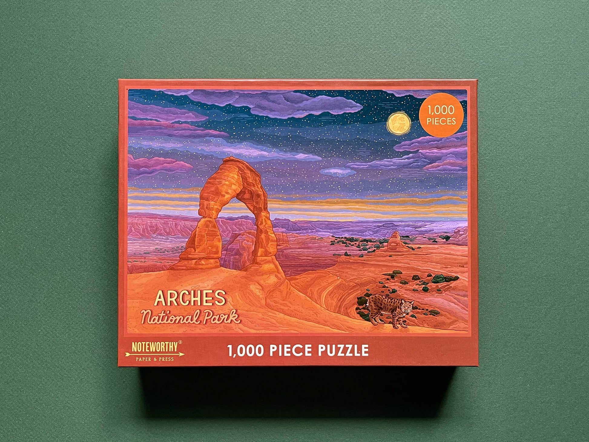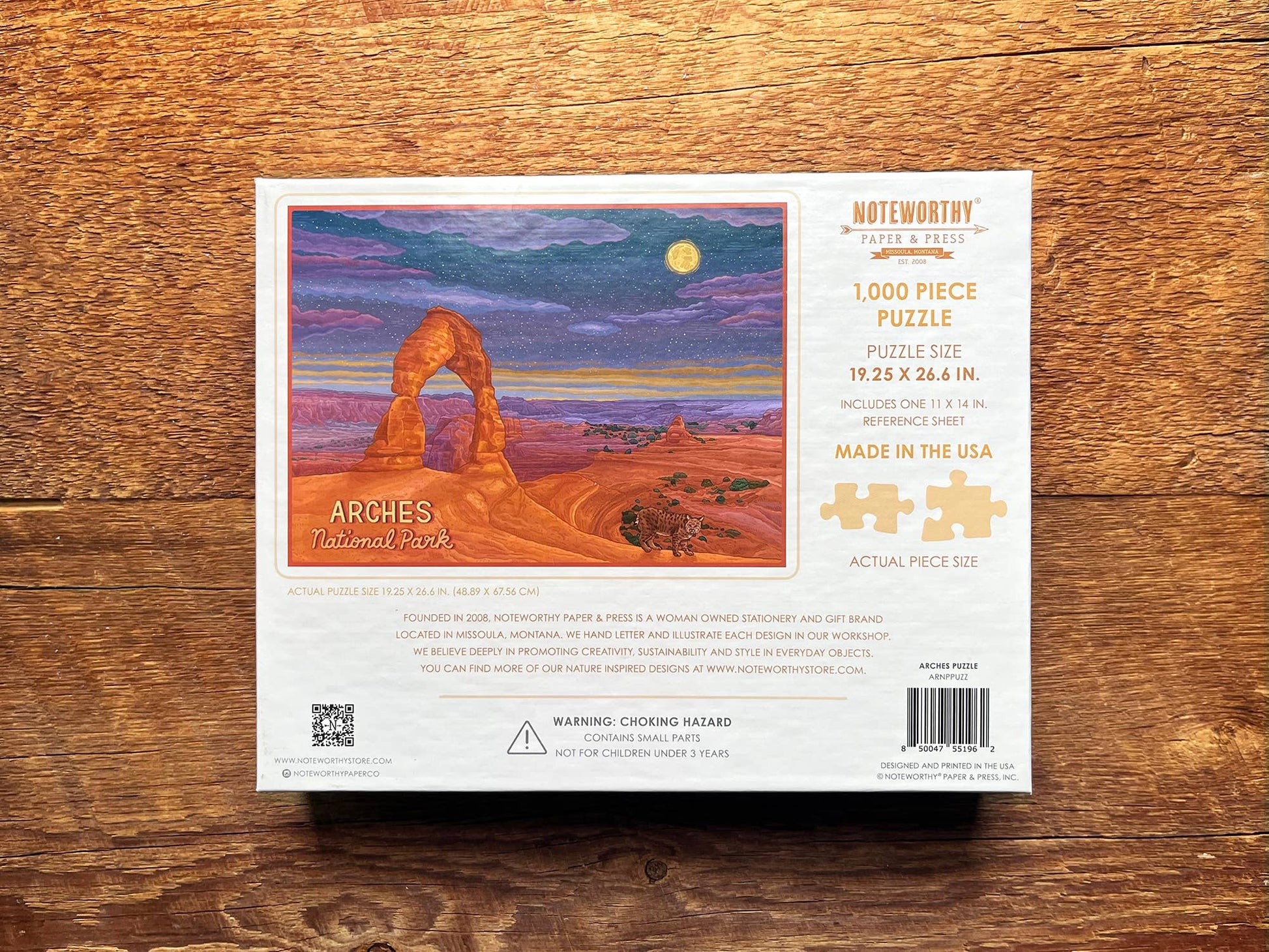We're excited to present this design from our brand new National Parks puzzle collection! Arches National Park Puzzle by Noteworthy Paper & Press. Size - 19.5" x 26.6" Piece Count - 1,000 11" x 14" Puzzle image insert included in box Comes in shrink wrapped box Made in the U.S.A. All images, products and designs © Noteworthy Paper & Press