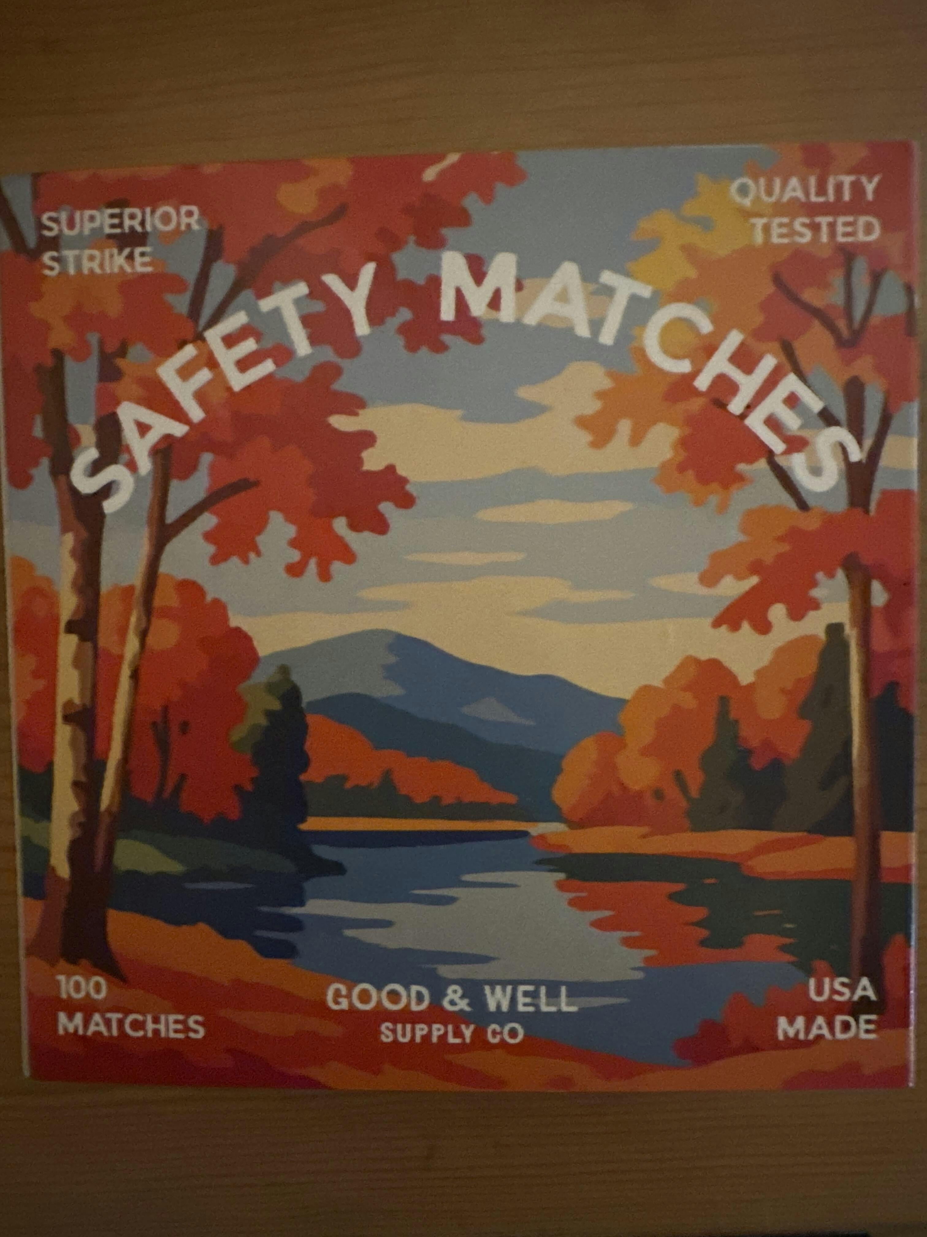 Golden leaves, still water, and one quiet moment before dusk — this double-sided matchbox captures the calm beauty of autumn in full color. With its vintage paint-by-number design and crisp, woodsy palette, it’s the perfect spark for cozy nights and candlelit cabins.