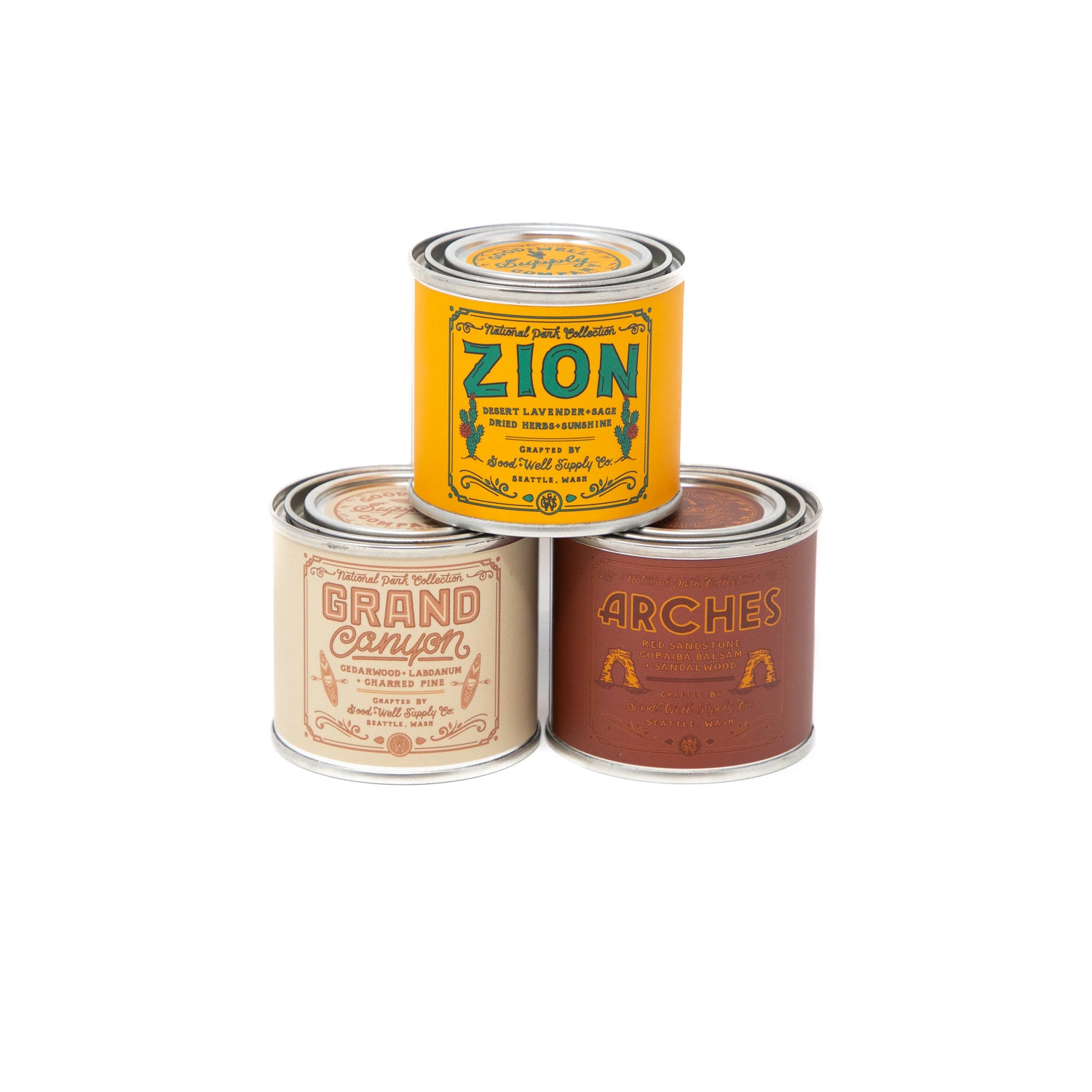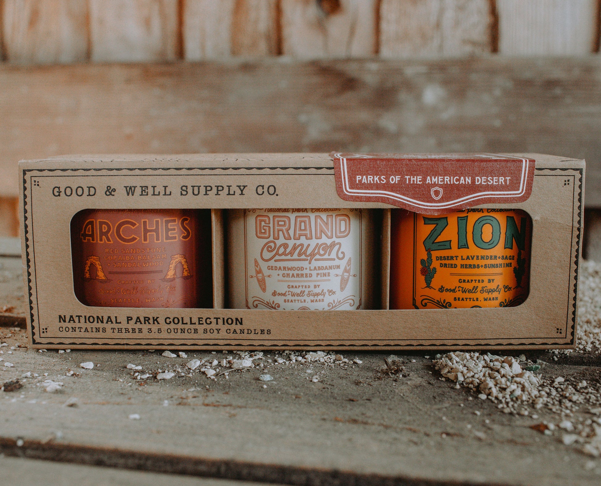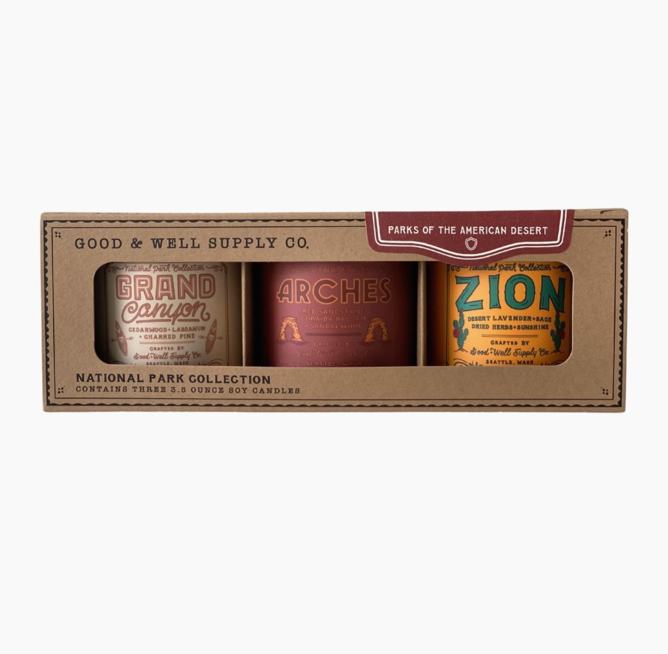 These gift-able sets of three, 4 oz. candles represent some of the most visited regions and National Parks around America. Though they're petite, these candles are mighty; boasting our classic National Parks scents that are sure to fill the room with all the scents of the Great Outdoors. Plus, they look great in our ready-to-gift topographical kraft boxes!