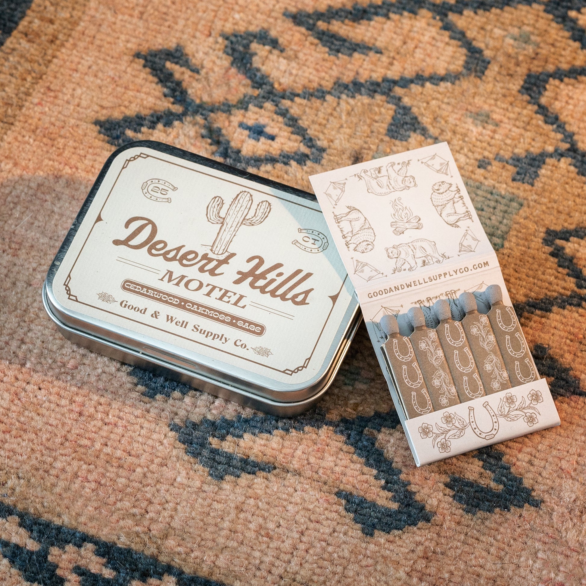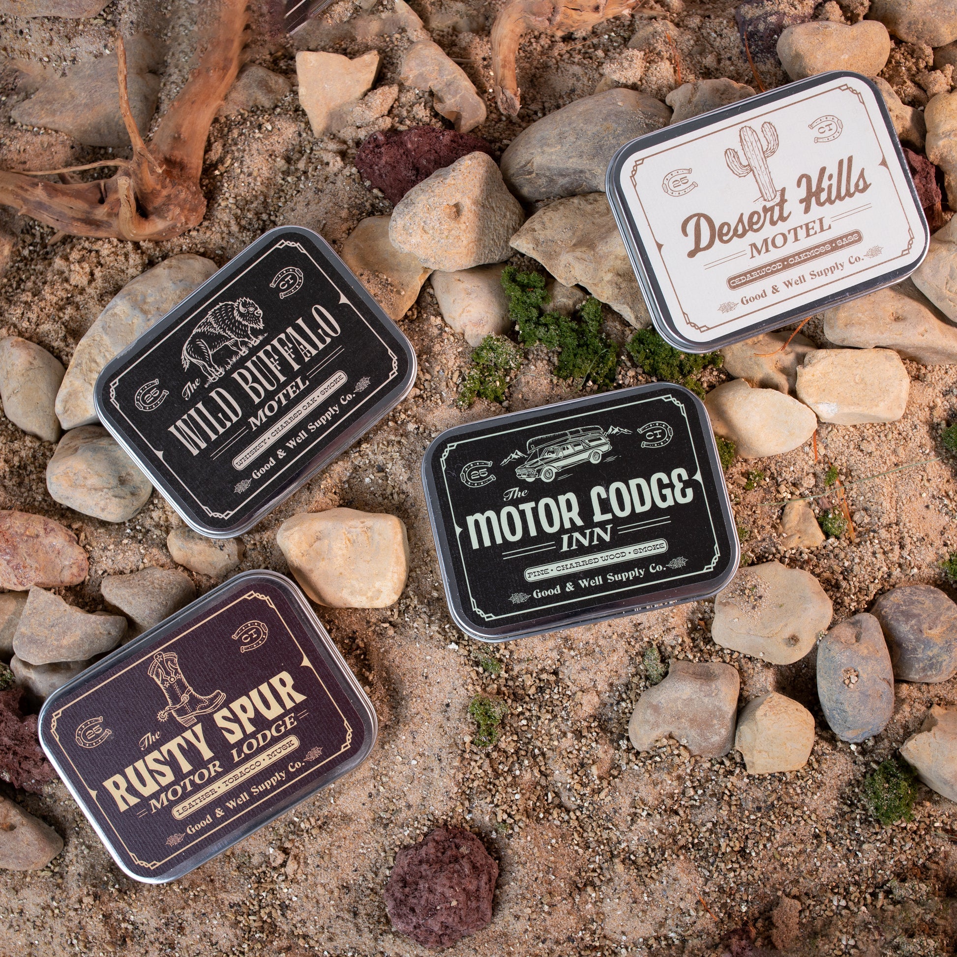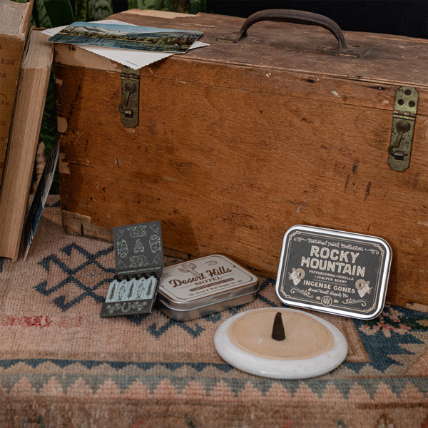 Our new Roadside Motels collection harkens back to the bygone days of the "great American roadtrip." This collection is inspired by the retro signs, neon lights and charming names of the motels and inns that lined the highways in midcentury America, and because it's always fun to bring back souvenirs from your travels, each incense tin comes with a matching vintage inspired motel matchbook tucked inside.